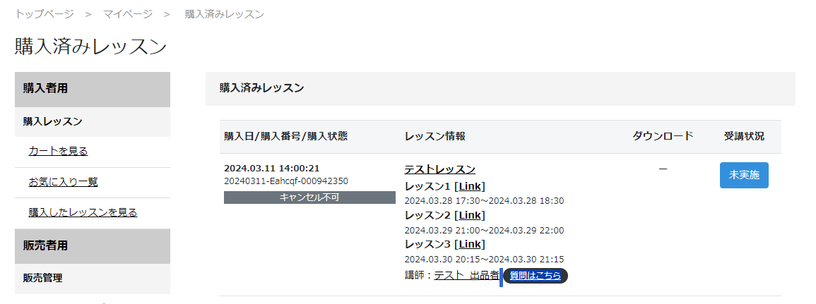レッスンの受講が終わりましたらレッスンが受講できたかを「購入したレッスンを見る」より、受講したレッスンについて受講した旨を登録しましょう。